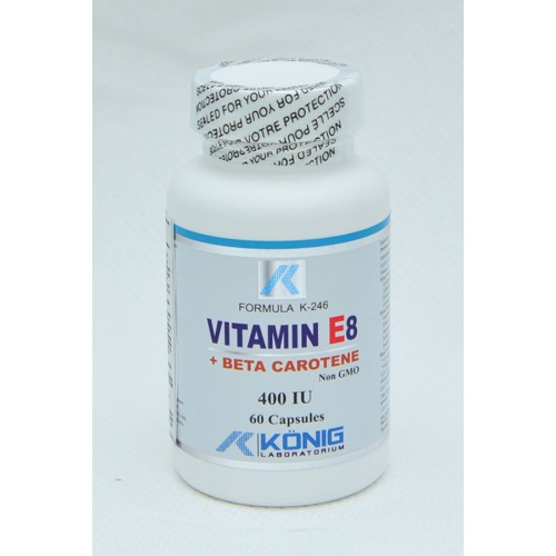 Vitamina E8 de la KONIG contine cei 8 membriai familiei Vitamina E si anume, 4 Tocoferoli si 4 Tocotrienoli extrasi dinplante in forma lor naturala, ne-esterificata. Cei 8 membri au unele functiisimilare dar au si functii complet diferite insa cu actiune complementara. Deasemenea ei actioneasa asupra unor organe diferite din corpul uman. Toti auefect antioxidant cu d’alfa-tocoferol (Vitamina E obisnuita) fiind principalulantioxidant. Dar, gama-tocoferol de exemplu este singurul care are capacitateasa detoxifice radicalii de azot care sunt asociati cu bolile neurologice,inflamatiile si cancerul de prostata sau san.